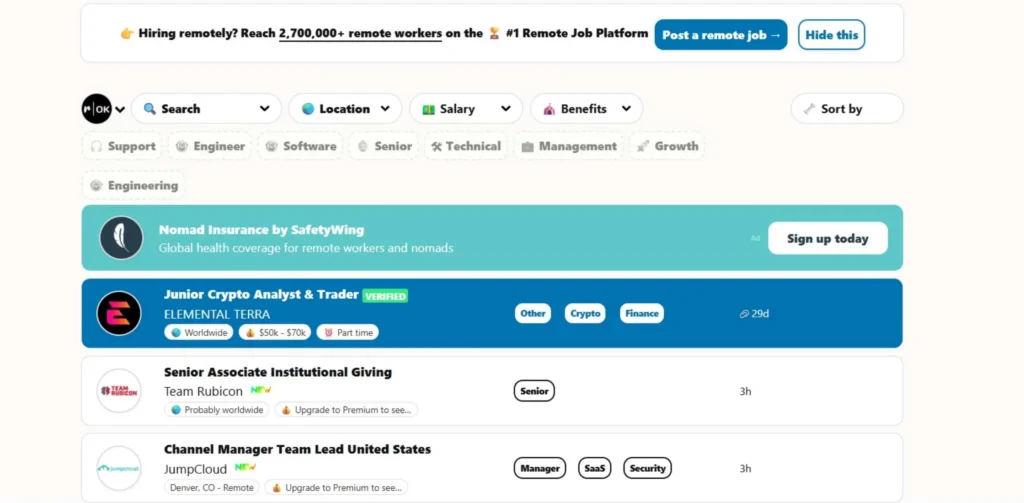 Also, it offers information on the salary trends and the top skills that are currently in demand for remote workers in 2026. Additionally, the simple interface of this site makes it very convenient to go through the hundreds of job postings without feeling overwhelmed by the number of ads.