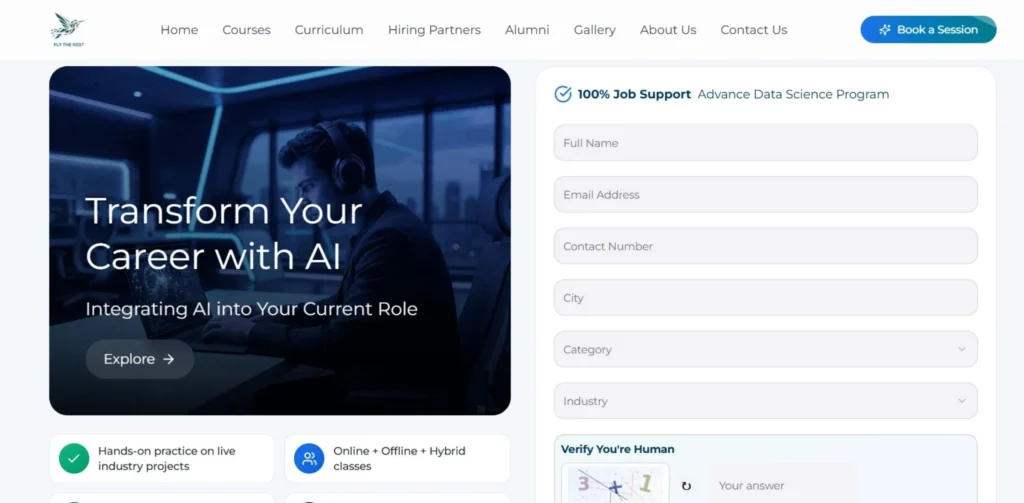 Fly The Nest is a top-rated institute that helps bridge the gap between concepts and actual skills with the help of its association with Deetsdigital, making it a strong choice for those looking to pursue a data science course in Ahmedabad. They have mentors from IITs and IIMs who ensure you receive a top-notch education that helps you become a competent ML Engineer. They have a strong focus on live projects that help you build a portfolio you can flaunt.