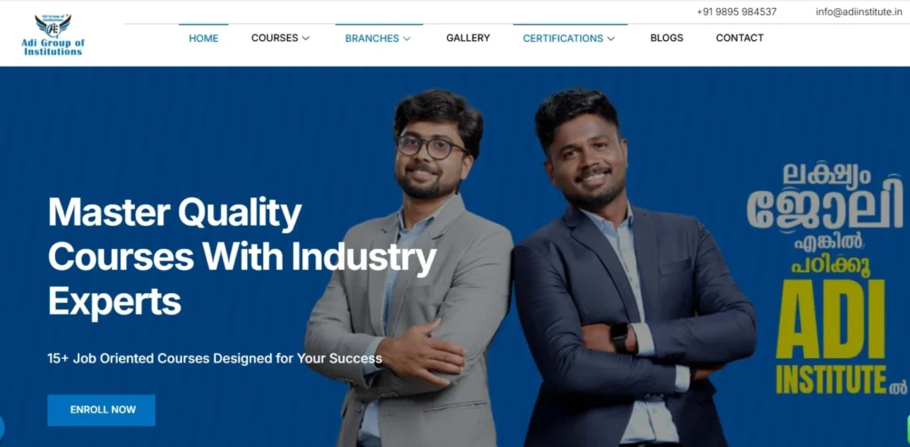 Adi Group of Institutions is known as one of the most celebrated training schools in Kerala, offering a certified digital marketing course in Trivandrum with AI and design-focused modules. Established in 2014, the institute delivers industry-relevant skills along with 100% employment support to help students build successful careers.